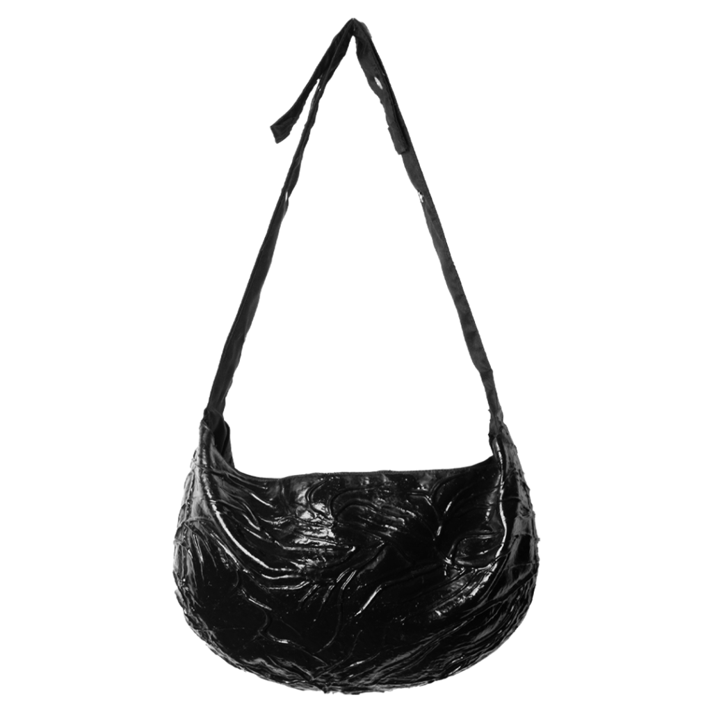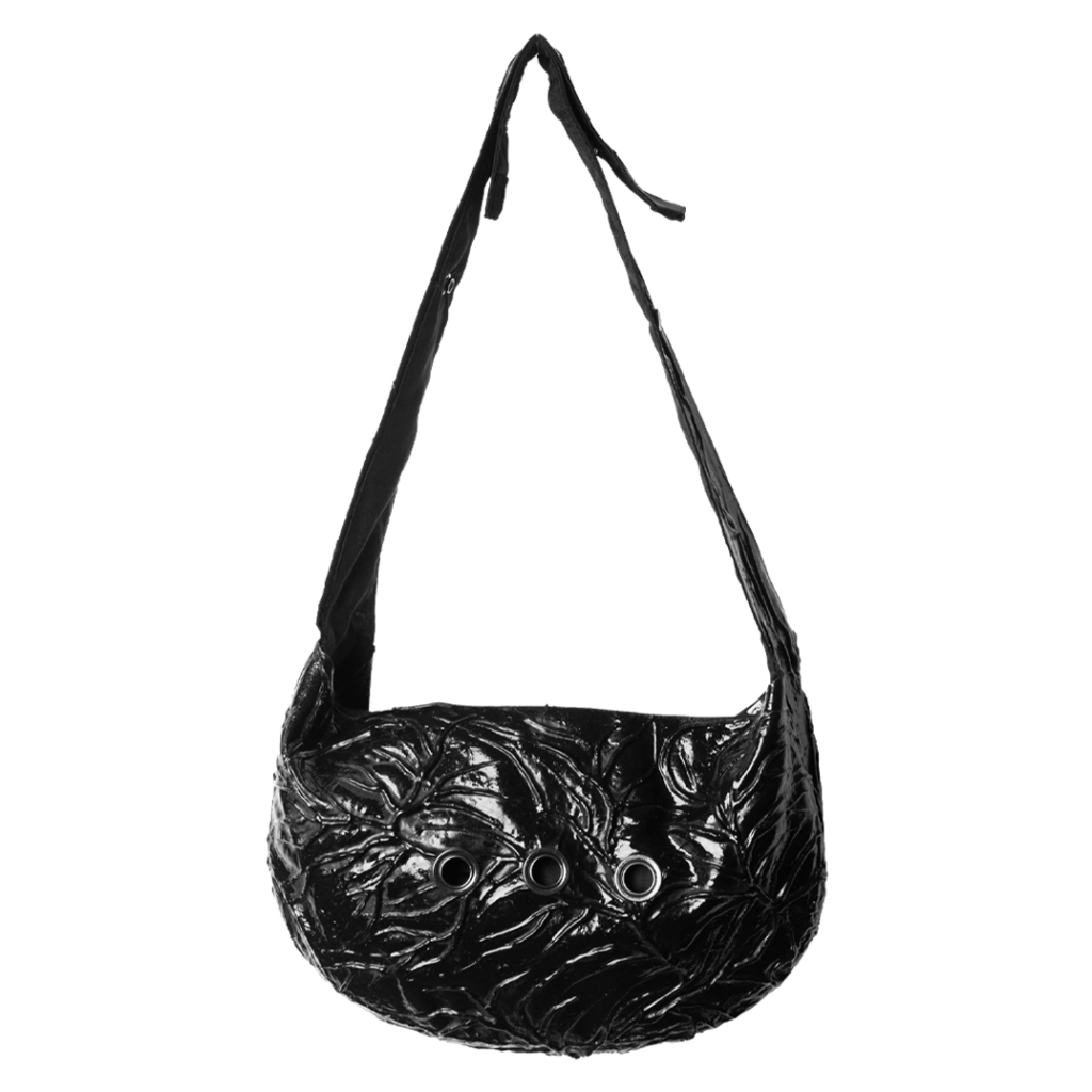 shoulder and crossbody bag with latex application, oxidized silver YKK zipper opening, adjustable snap buttons, and three aged silver eyelets centered on the front.