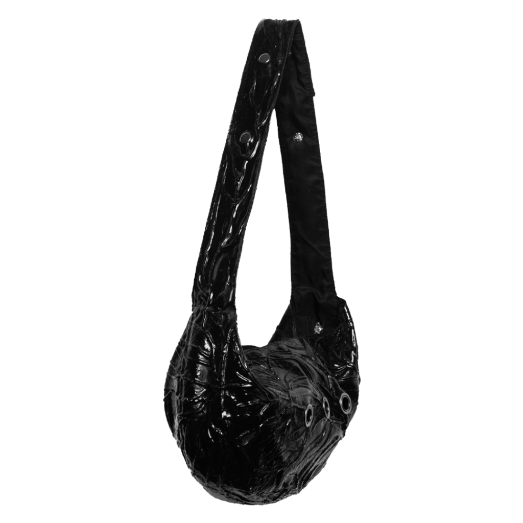 bolsa de ombro tiracolo com aplicação de látex com abertura em zíper YKK prata oxidado, regulagem por botões de pressão e 3 ilhoses prata envelhecidos centralizados.