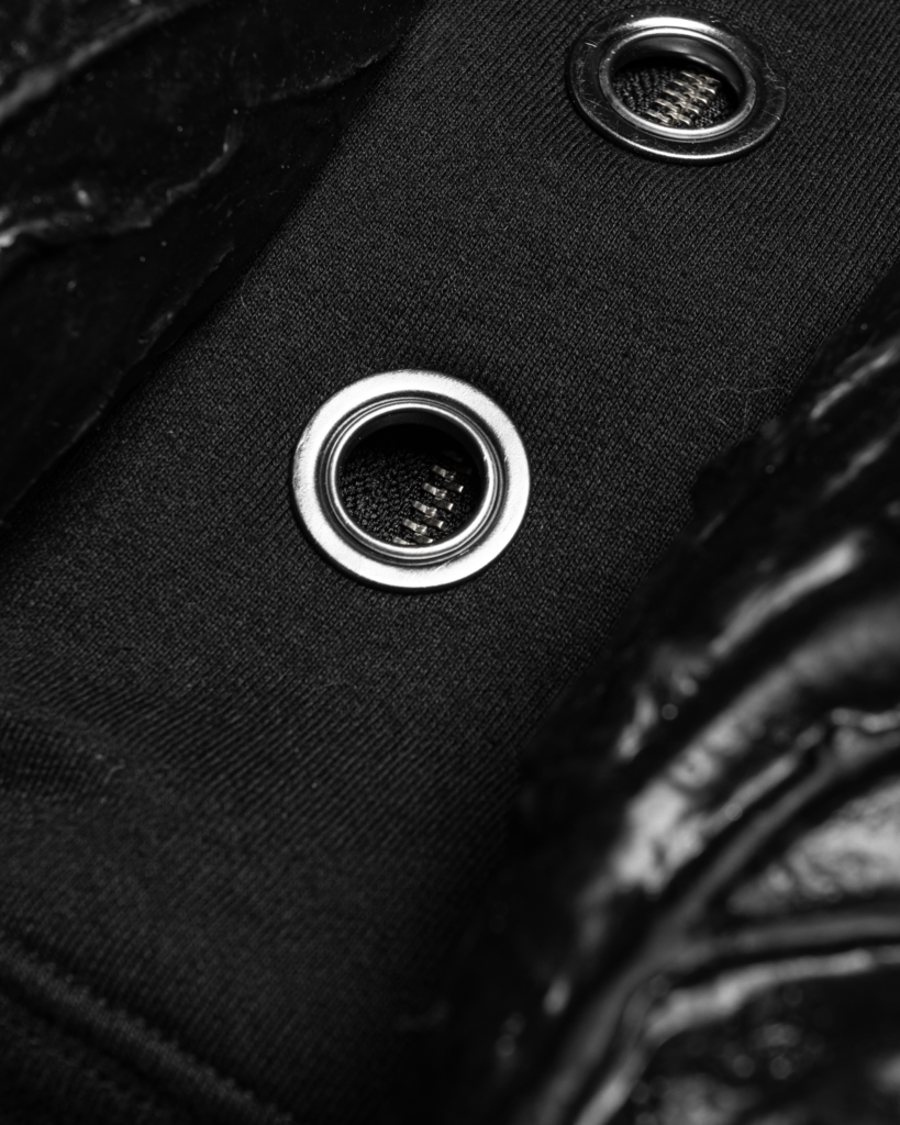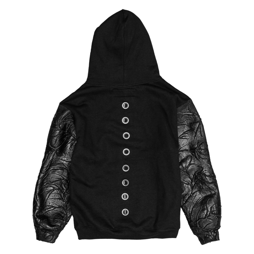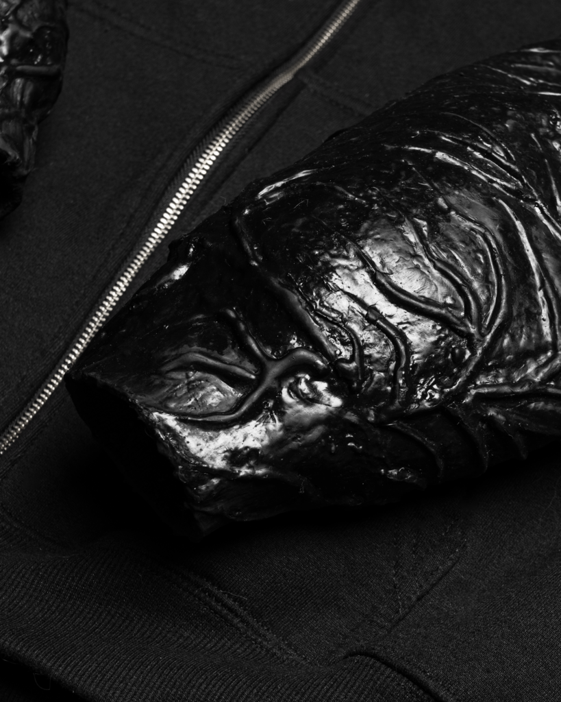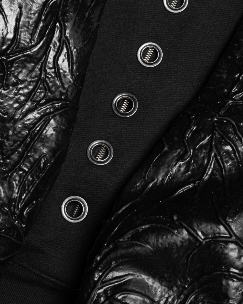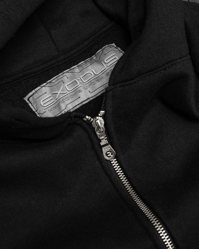 100% cotton kangaroo hoodie with internal fleece, front opening with oxidized silver YKK zipper, exo:dus inner label, latex applications on the sleeves, and eight aged silver eyelets on the back.