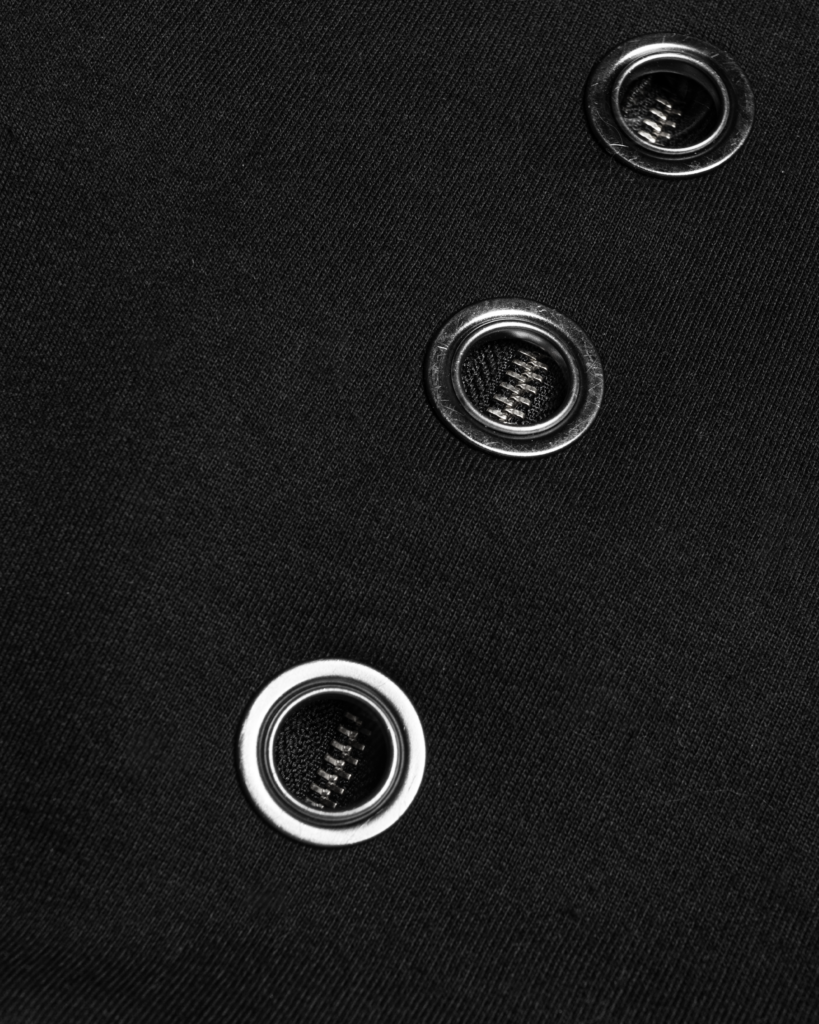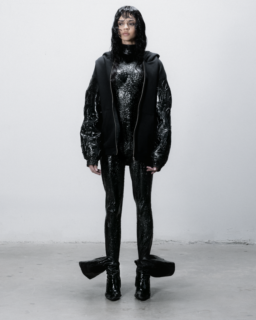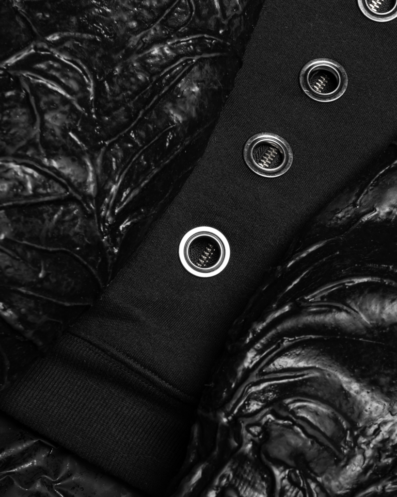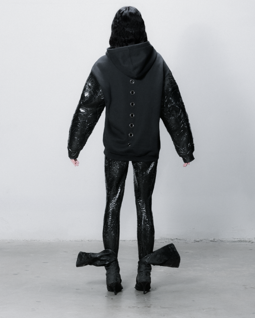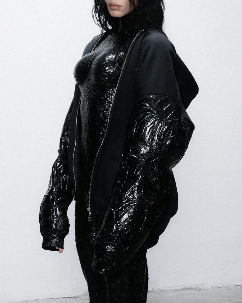 100% cotton kangaroo hoodie with internal fleece, front opening with oxidized silver YKK zipper, exo:dus inner label, latex applications on the sleeves, and eight aged silver eyelets on the back.