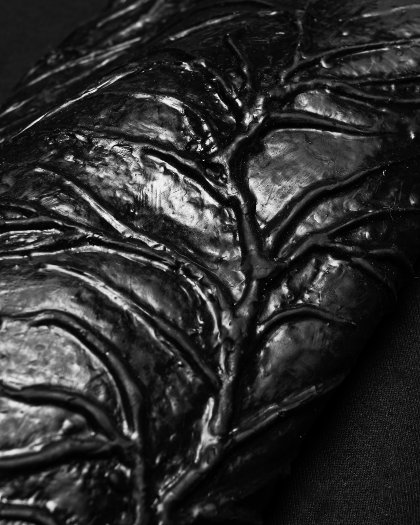 the latex applications are the result of a handcrafted process by artist Aun Helden, making each piece unique in its design and finish.