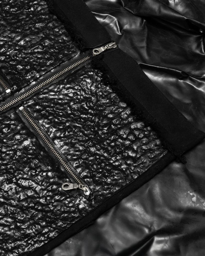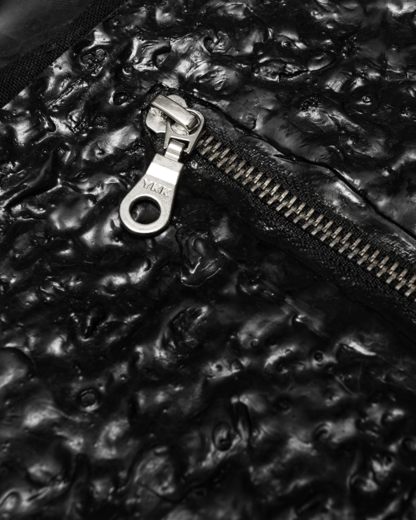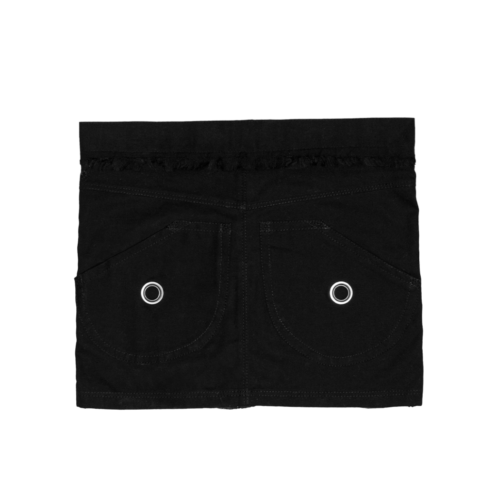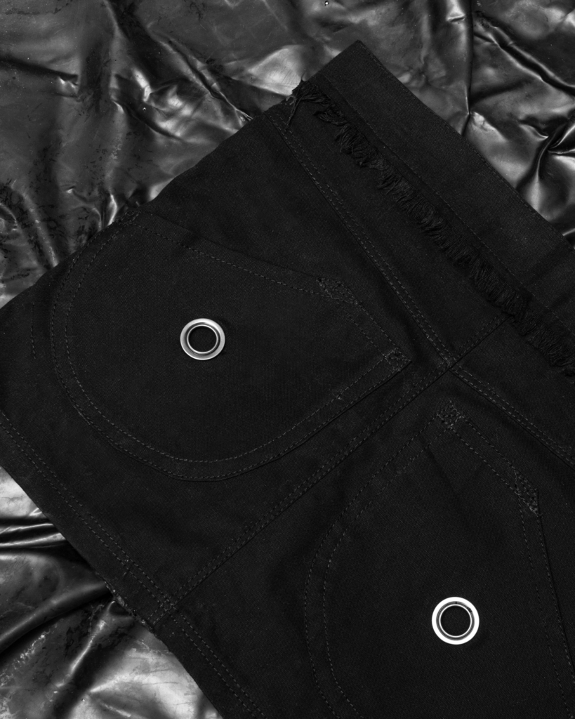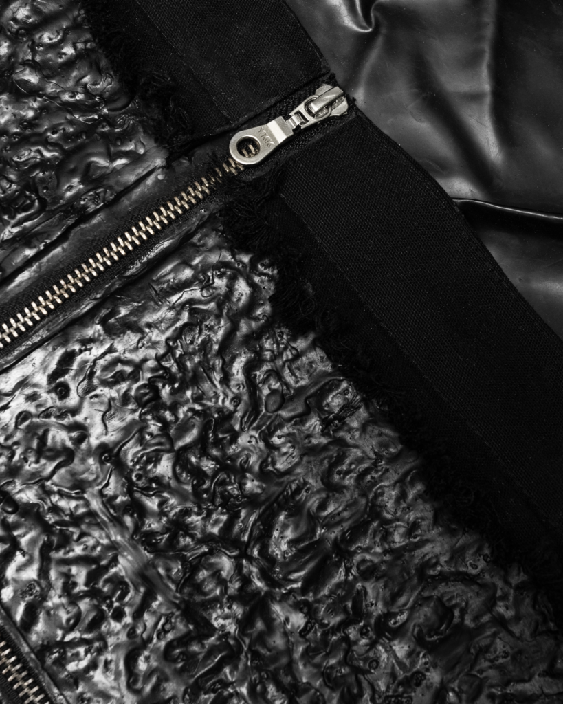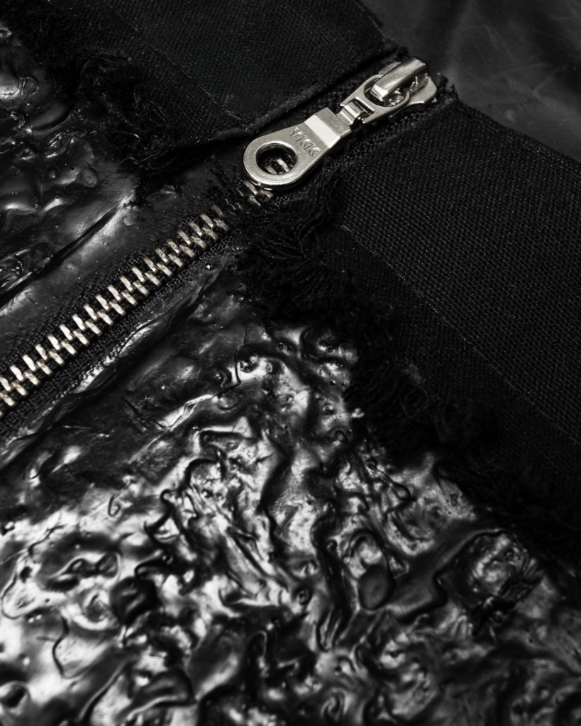high-grammage 100% cotton twill skirt with latex application on the front, oxidized silver YKK zippers for front and side openings, and custom back pockets with eyelets.